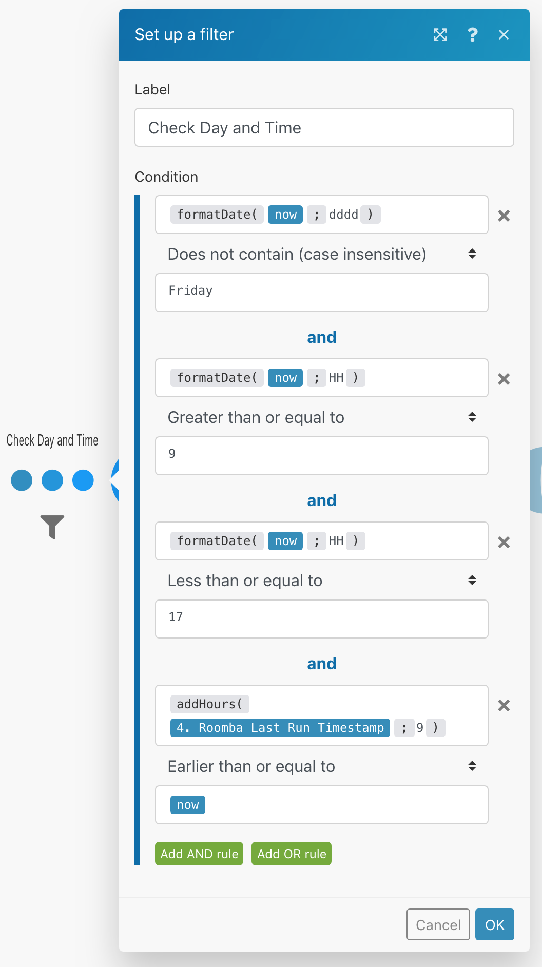 This will allow the scenario to check that timestamp the next time it runs. The Filter in the scenario will make sure the scenario doesn't kick off the Roomba twice in one day.