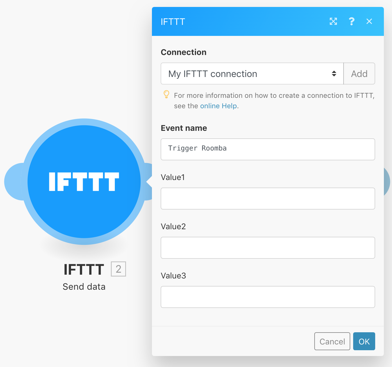 Unfortunately, Integromat can't kick off a Roomba directly, and Roomba doesn't provide a public API for automators to use. (These would be great things to change if anyone from iRobot is reading this!) So, I have Integromat make a call to an IFTTT Maker Event.