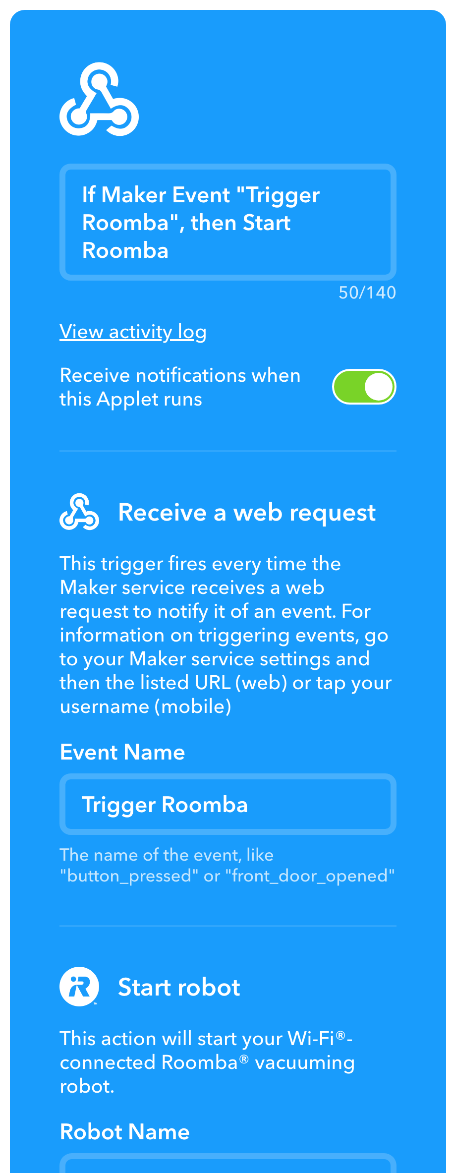 The IFTTT applet kicks off the Roomba, and I get a notification of that on my phone.