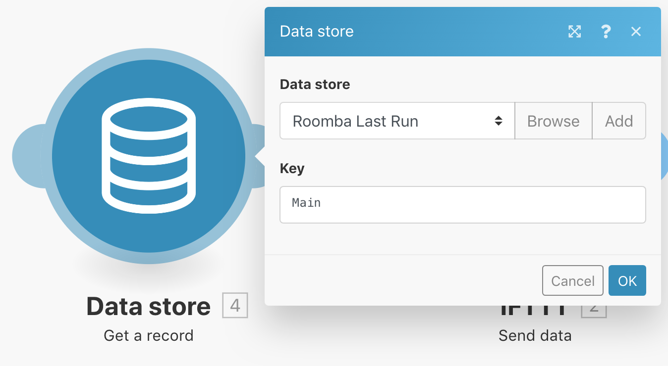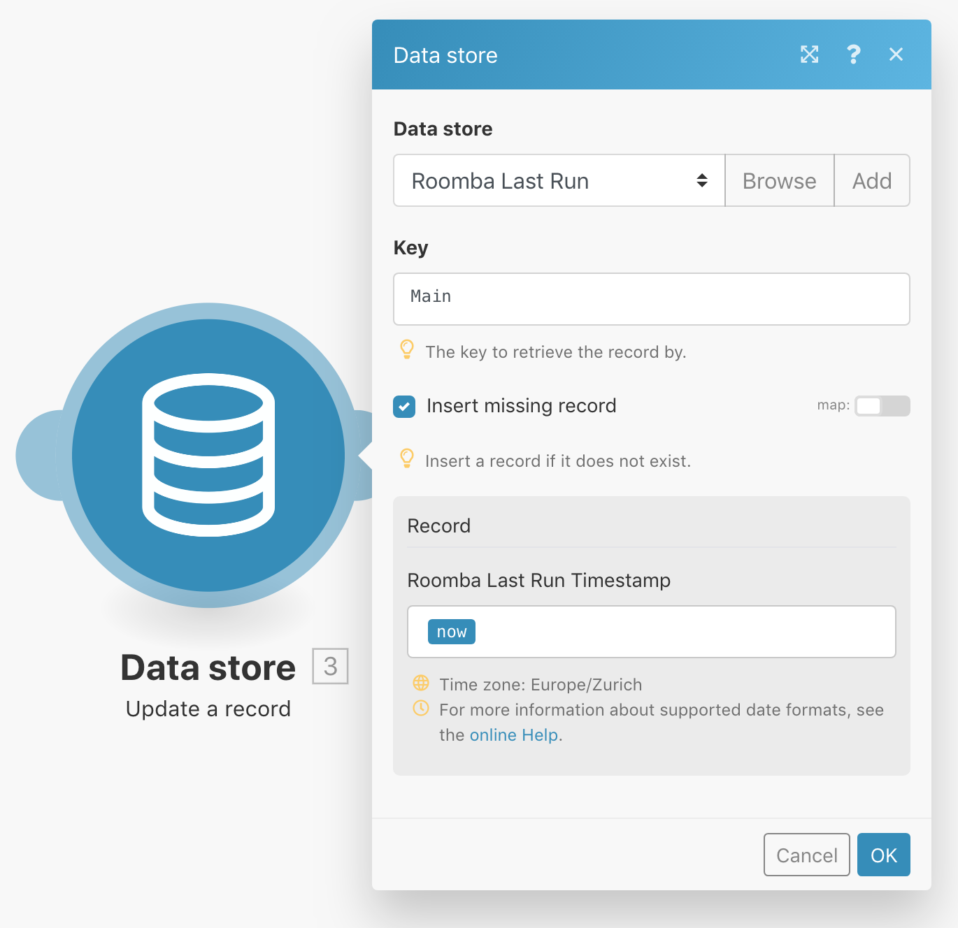 Finally, the Integromat scenario records a new timestamp in the Data Store for when it last successfully kicked off the Roomba.